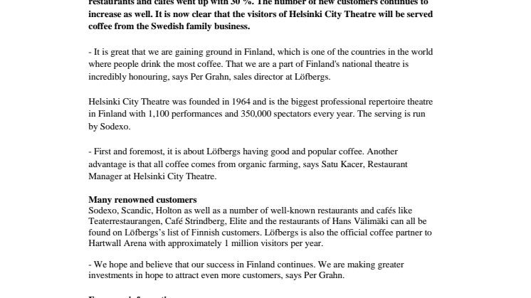 The coffee roaster Löfbergs continues to grow in Finland. In 2013, the sales to hotels, restaurants and cafés went up with 30 %. The number of new customers continues to increase as well. It is now clear that the visitors of Helsinki City Theatre will be served coffee from the Swedish family business.