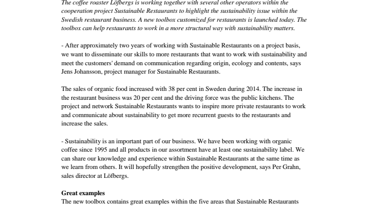 The coffee roaster Löfbergs is working together with several other operators within the cooperation project Sustainable Restaurants to highlight the sustainability issue within the Swedish restaurant business. A new toolbox customized for restaurants is launched today. The toolbox can help restaurants to work in a more structural way with sustainability matters.