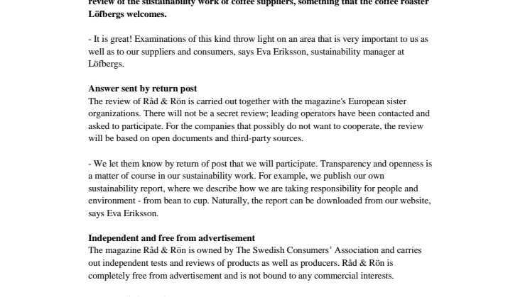 In 2014, the Swedish consumer magazine Råd & Rön will carry out an international review of the sustainability work of coffee suppliers, something that the coffee roaster Löfbergs welcomes.