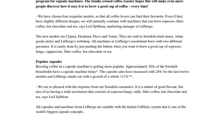 Design, function and quality. These are the key words when Löfbergs is launching a new model program for capsule machines. The family-owned coffee roaster hopes this will make even more people discover how it easy it is to brew a good cup of coffee - every time!