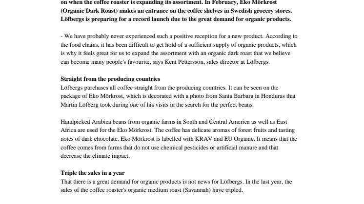 - We have probably never experienced such a positive reception for a new product. According to the food chains, it has been difficult to get hold of a sufficient supply of organic products, which is why it feels great for us to expand the assortment with an organic dark roast that we believe can become many people's favourite, says Kent Pettersson, sales director at Löfbergs.