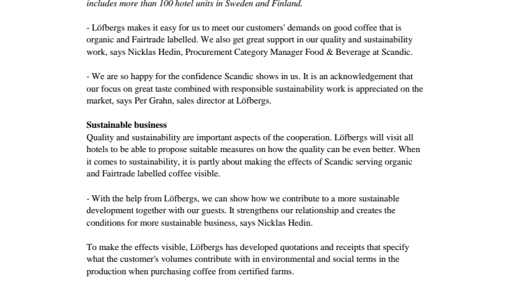 - Löfbergs makes it easy for us to meet our customers' demands on good coffee that is organic and Fairtrade labelled. We also get great support in our quality and sustainability work, says Nicklas Hedin, Procurement Category Manager Food & Beverage at Scandic.