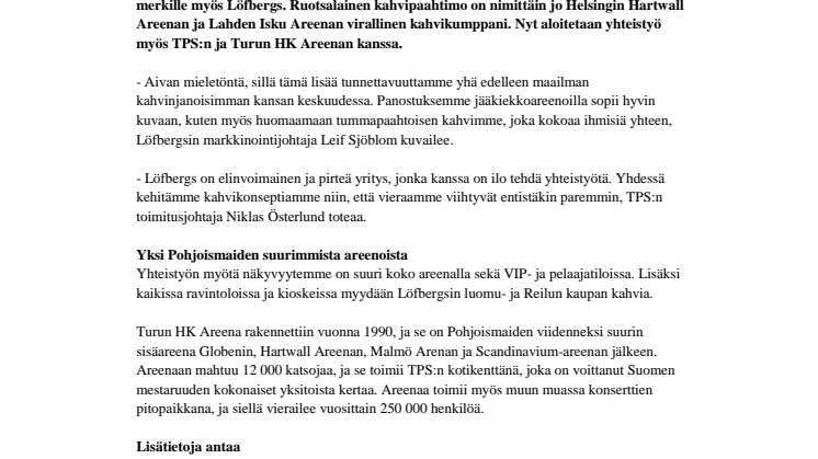 Jääkiekko ja kahvi ovat kaksi suomalaisten rakastamaa asiaa, ja tämän on pannut merkille myös Löfbergs. Ruotsalainen kahvipaahtimo on nimittäin jo Helsingin Hartwall Areenan ja Lahden Isku Areenan virallinen kahvikumppani. Nyt aloitetaan yhteistyö myös TPS:n ja Turun HK Areenan kanssa.