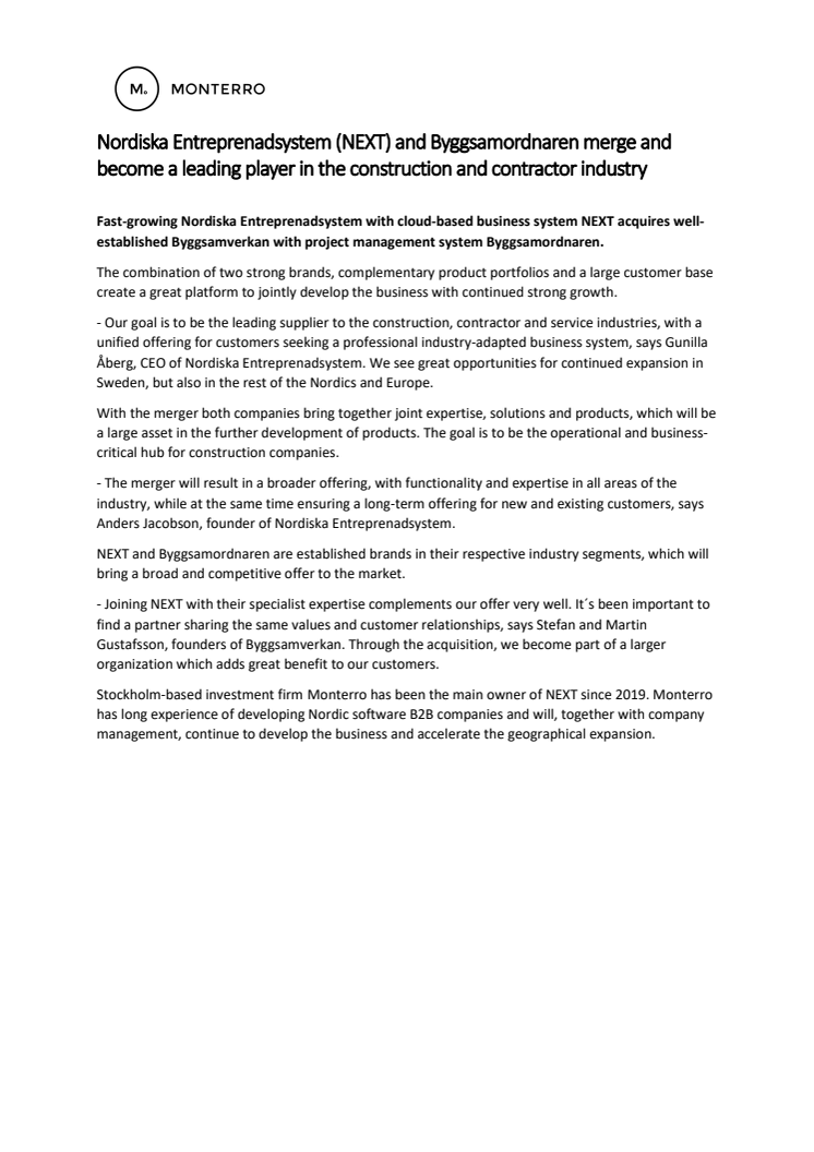 Nordiska Entreprenadsystem (NEXT) and Byggsamordnaren merge and become a leading player in the construction and contractor industry