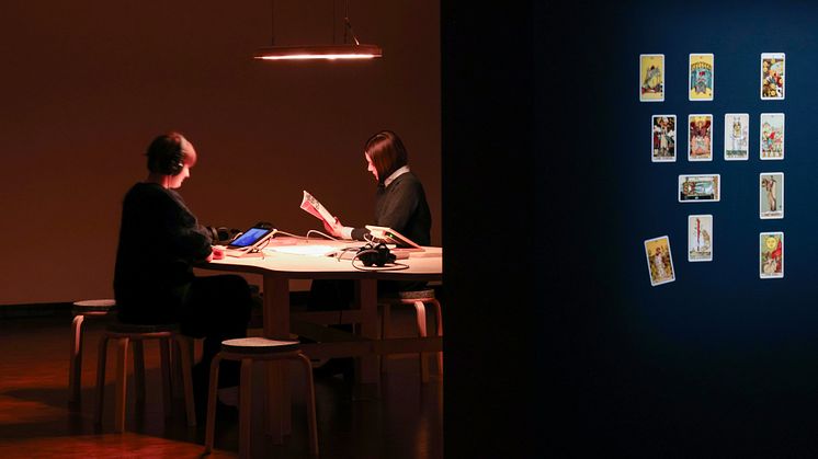 The exhibition consists of several works including three of the artists’ films: Serpent Rain (2016), 4 Waters – Deep Implicancy (2019) og Soot Breath // Corpus Infinitum (2020). Each film is accompanied by a tarot card spread next to wall texts in Norwegian, English and Northern Sámi. The reference material for the films is presented in the exhibition, inviting deeper engagement with the broader framework of Corpus Infinitum. Liisa-Rávná Finbog is organising a series of discursive events in the exhibition spaces, which culminate in a conference on 24–25 May 2024 with Denise Ferreira da Silva and Arjuna Neuman.