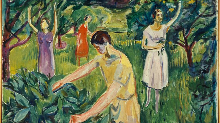 From 1916, Munch lived at Ekely, a villa surrounded by overgrown gardens and farmland, which he painted in many different ways. In this garden, nature is more than just the background – it is bursting with life, greenness and growth. By contrast, the mood among the women seems strange and melancholy. The women’s colourful clothing contrasts with the many green shades of nature.