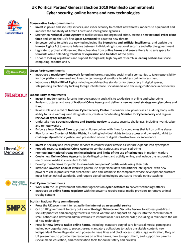 Cyber security, online harms and new technologies in the UK political parties’ manifestos