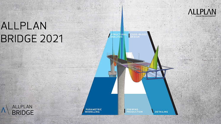 Munich, October 8, 2020 - ALLPLAN today presented Allplan Bridge 2021. The new version enables bridge engineers to work with one single solution from the creation of a parametric 4D model to structural analysis, reinforcement design and detailing. In addition to improved modeling functionality and the consideration of earthquake effects, code-based design according to Eurocode is now available as a link between structural analysis, design and detailing. Allplan Bridge 2021 thus maps the complete BIM process in bridge projects – an innovation in the industry. This further improves the design process in terms of both time and quality.