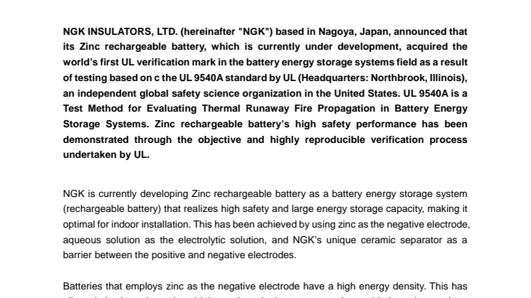 • Zinc Rechargeable Battery Cell Acquires the World’s First-Ever UL Verification Mark in the Battery Energy Storage Systems Field
