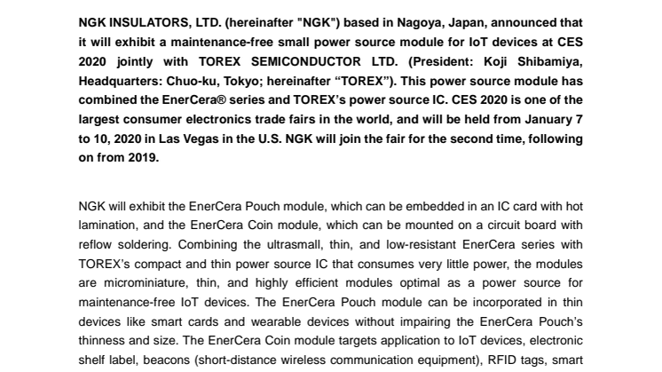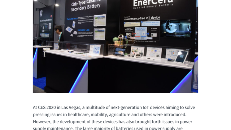 • Chip-type Ceramic Secondary Battery “EnerCera” Series of New Power Sources for IoT Devices Exhibiting a Power Source Module Jointly with TOREX SEMICONDUCTOR LTD. in CES 2020