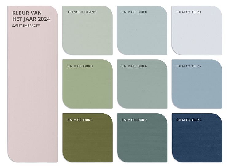 Het kleurpalet wat het vrolijke kleurverhaal vertelt wordt binnen de Nederlandse verfmarkt aangeboden onder het Flexa Kleurentrends 2024 palet. Dit goed te combineren palet bestaat uit dromerige lilatinten en moderne gelen en natuurlijk Sweet Embrace™. Wil je de kleur vooraf in de vorm van verf op je muur zien, dan zijn de tien kleuren vanaf 12 september 2023 als Flexa Kleurtester verkrijgbaar in de verfwinkel en online. Alle kleuren uit de drie ColourFutures™ paletten zijn te mengen in Flexa Lakken en Muurverven waaronder Flexa Creations en Flexa Easycare. Tevens zijn ze als Flexa Kleurtester op Flexa.nl te bestellen.