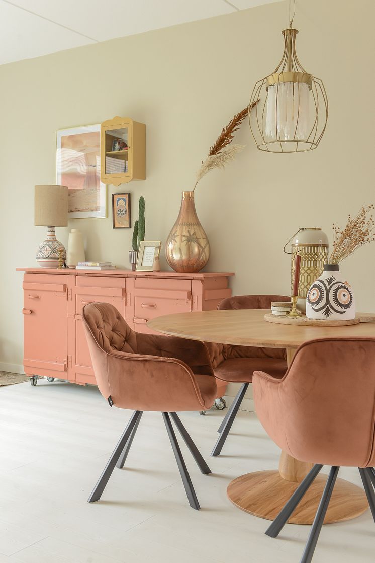 Kies voor twee basistinten en twee tot drie accentkleuren. Verdeel deze kleuren vervolgens goed over je interieur, dus de kleur van de muur bijvoorbeeld terug laten komen in een kast en accessoires. Je kan zelfs meubels een kleur geven om zo een mooie balans te creëren. Op die manier creëer je een harmonieus interieur waar je je echt thuis voelt!