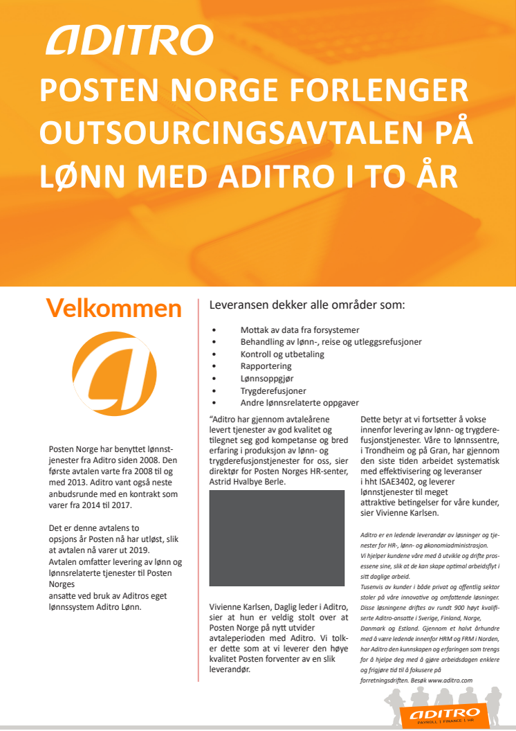 Posten Norge har benyttet lønnstjenester fra Aditro siden 2008. Den første avtalen varte fra 2008 til og med 2013. Aditro vant også neste anbudsrunde med en kontrakt som varer fra 2014 til 2017.