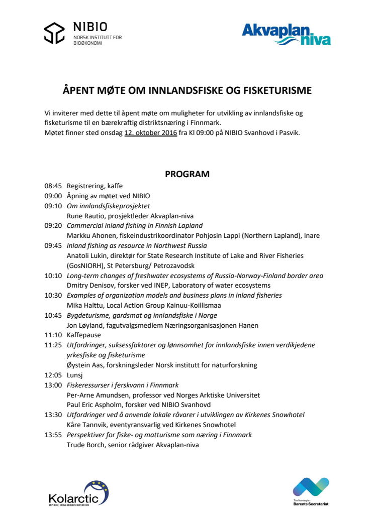 Vi inviterer med dette til åpent møte om muligheter for utvikling av innlandsfiske og fisketurisme til en bærekraftig distriktsnæring i Finnmark. Møtet finner sted onsdag 12. oktober 2016 på NIBIO Svanhovd i Pasvik. Arrangementet er en del av et Akvaplan-niva prosjekt for kunnskapsoverføring mellom Norge, Russland og Finland med tanke på utvikling av innlandsfiske i Finnmark.