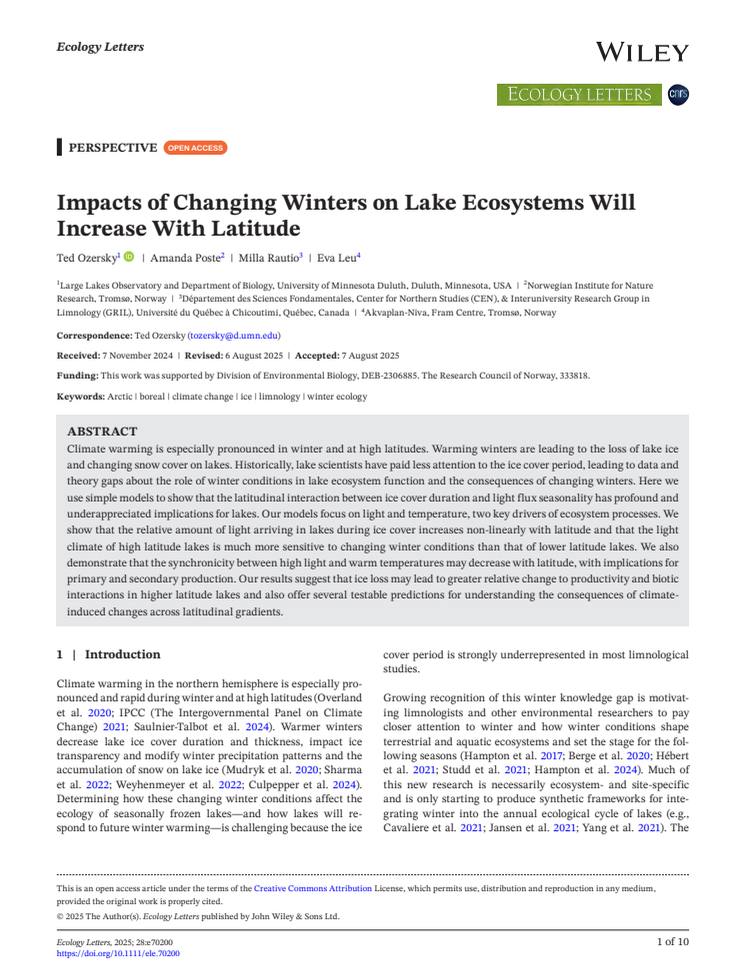 Impacts of Changing Winters on Lake Ecosystems Will Increase With Latitude - Publication in Ecology Letters