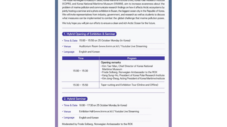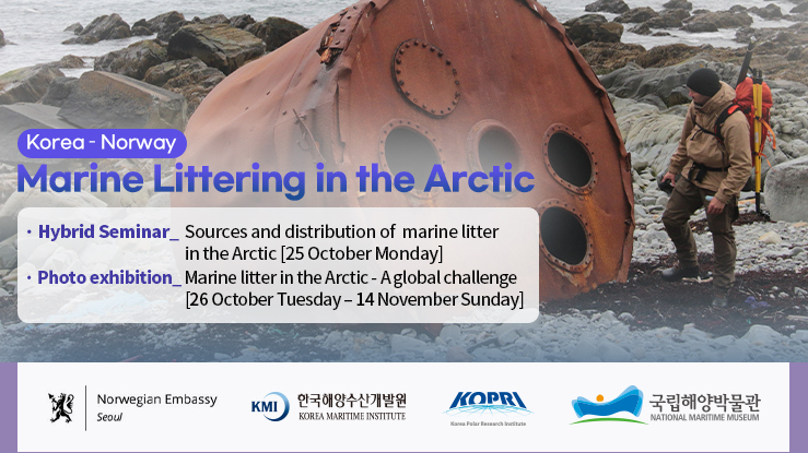 The Royal Norwegian Embassy in Seoul, Korea Maritime Institute (KMI), Korea Polar Research institute (KOPRI), and Korea National Maritime Museum (KNMM), aim to increase awareness about the problem of marine pollution and communicate research findings on how affects the Arctic ecosystems by jointly hosting a hybrid seminar and a photo exhibition in Busan, the biggest ocean city in the Republic of Korea. Representatives from industry, government, and research as well as students are invited to discuss what measures can be implemented to combat the global challenge that marine pollution poses.