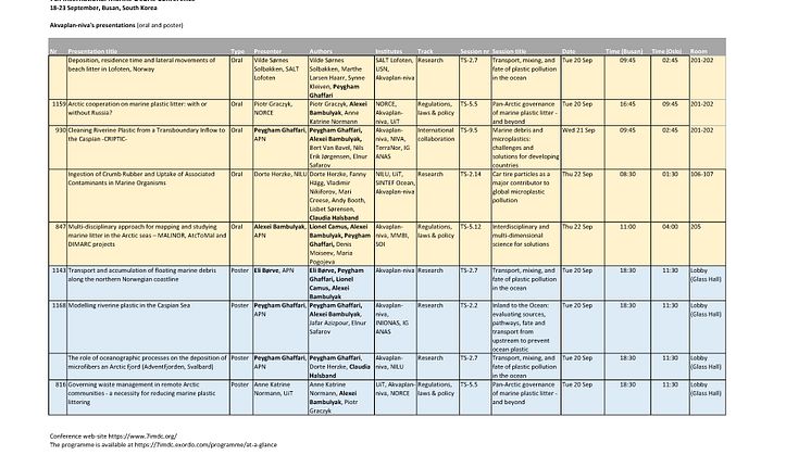 On Thursday, the 22nd Claudia Halsband will co-chair a technical session 'Car tire particles as a major contributor to global microplastic pollution'. The same day, at the session 'Interdisciplinary and multi-dimensional science for solutions' Alexei Bambulyak will present 'Multi-disciplinary approach for mapping and studying marine litter in the Arctic seas – MALINOR, ArcToMal and DIMARC projects' on three projects led by Akvaplan-niva (Lionel Camus), financed by the Research Council of Norway (NFR), the Norwegian Ministry of Climate and Environment (KLD), and the Norwegian Retailers Environmental Fund (HMF).