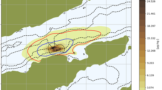 Figur: Spredningsmodellering av EMB konsentrasjon 30 dager etter bruk av flytefôr. Blå linje viser område som overskrider 0,235 µg/kg og rød linje område som overskrider 0,0235 µg/kg. Innerste linje viser 100 meter avstand fra merd.