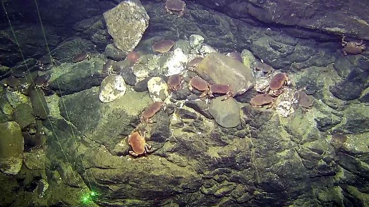 Observasjoner av tette forekomster av taskekrabber på mer enn 400 m dyp i fjorder nord i Nordland denne vinter kan tyde på at arten nå er på offensiven i kampen om herredømmet på sjøbunnen.