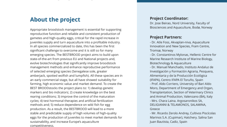 As a result, the BESTBROOD will lead to a more stable and predictable supply of high volumes of high-quality eggs for the production of juveniles to meet market demands for sustainability, and increase Europe’s aquaculture competitiveness.