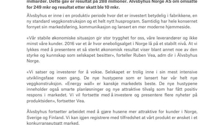 «Vår stabile økonomiske situasjon gir stor trygghet for oss, våre leverandører og ikke minst våre kunder. 2016 var et år hvor eneboligsalget i Norge lå på et stabilt nivå. At vi lykkes med å presentere et så sterkt økonomisk resultat viser blant annet noe av den styrke og kunnskap som selskapet besitter», forteller Ruben Vea, adm dir i Älvsbyhus Norge.