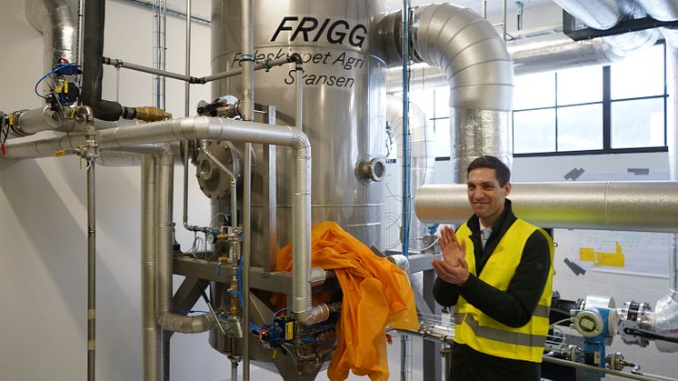 Tirsdag avduket klima- og miljøminister Andreas Bjelland Eriksen den industrielle varmepumpen «Frigg», som er installert i Felleskjøpets fôrfabrikk på Skansen i Trondheim.
