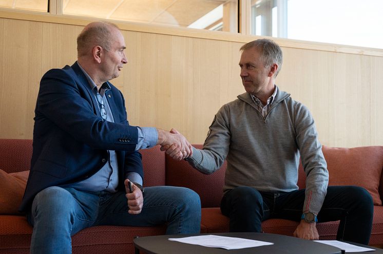 Adm.dir. i Anno museum, Sven Inge Sunde (t.v.) og daglig leder i Martin M. Bakken AS, Øyvind Nordal signerer kontrakt om bygging av Regionalt historiesenter på Domkirkeodden , Hamar.