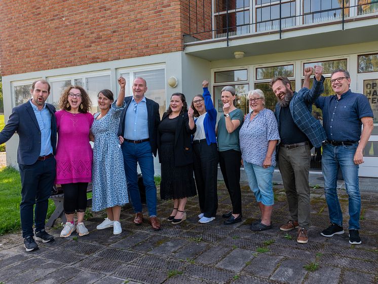 Jubler for jubileumstilskudd: Fra venstre Magnus Sempler Holte (Anno), kultursjef Kjersti krageberg (Stange kommune), Inger-Maren Slagsvold og Sven Inge Sunde (Anno), Margrethe Harr (på vegne av Regjeringen), Kari Fuglesang og Gry Linderud (Anno), Bjørg-Karin Ringen (Norsk utvandrermuseums venneforening), Per Øyvind Riise og Terje H. Joranger (Anno).