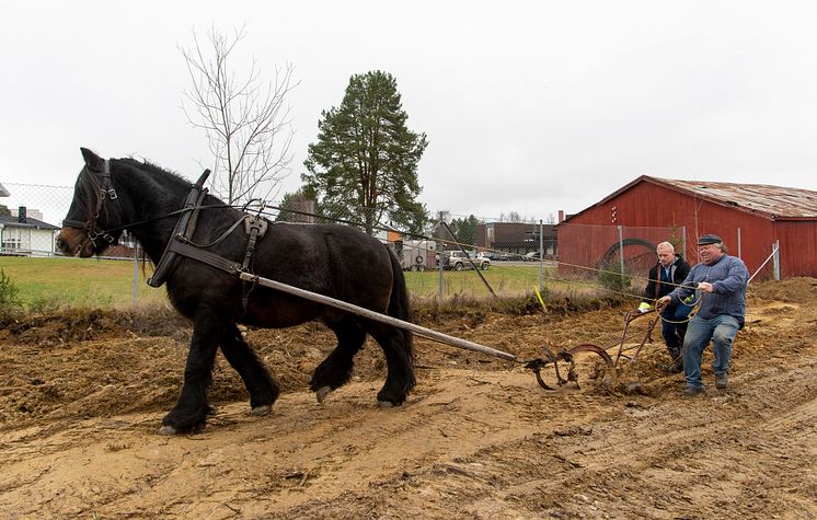 Markering av byggestart for Anno Dokumentasjonssenter med fellesmagasin, Glomdalsmuseet i Elverum 09.11.20. Knut Storberget markerer byggestarten på historisk vis - med hjelp av Ole Victor Larsen og hesten Bron.
