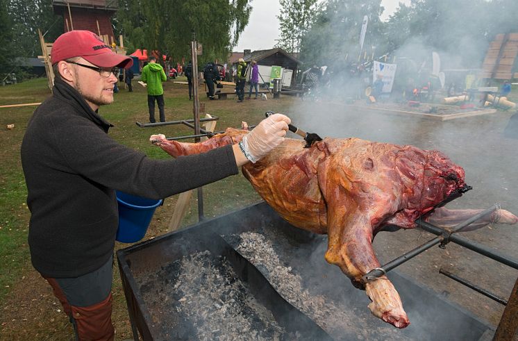 Helgrillet villsvin var noe mange ville smake på under jakt- og fiskdagene. Simen Skavern fra SKogselskapet var grillmester, da dette villsvinet ble slaktet og grillet som del av et villsvinseminar.
