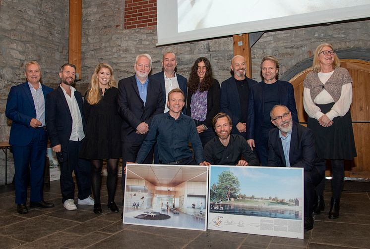 Styreleder i Anno, Knut Storberget (f.v.) sammen med juryen og vinnerne i arkitektkonkurransen: juryesekretær Gisle Nataas fra Norske arkitekters landsforbund, Inga Borud, advokat, oppnevnt av Hamar kommune, juryens leder Jørn Holme, sorenskriver i Vestfold tingrett, tidligere riksantikvar, Sven Inge Sunde, adm.dir. Anno museum, Lisbeth Funck, sivilarkitekt NAL, oppnevnt av Norske arkitekters landsforbund, Inge Dahlman, landskapsarkitekt NLA, oppnevnt av Norske landskapsarkitekters forening, Niels Marius Askim, sivilarkitekt NAL, oppnevnt av Norske arkitekters landsforbund og