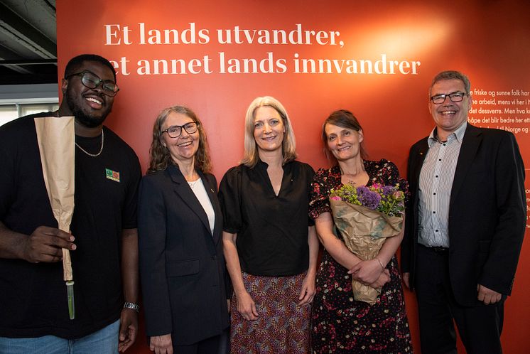 Abdulhakim "Hkeem" Hassane (fra venstre) sammen med prosjektgruppa for "Ukjent landskap": Kari Fuglesang, Gry Linderud, Inger-Maren Slagsvold og Terje H. Joranger. Med både historisk dybde og høyaktuelle perspektiver ble den nye hovedutstillingen "Ukjent landskap" offisielt åpnet ved Anno Norsk utvandrermuseum fredag. Utstillingen markerer 200-årsjubileet for den norske utvandringen til Amerika og knytter samtidig bånd til dagens migrasjonsvirkelighet – både med alvor og håp.