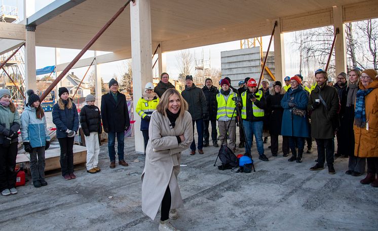 Riksarkivar Inga Bolstad foran gjestene på grunnsteinsnedleggingen. 4. desember 2024 ble grunnsteinen i regionalt historiesenter på Anno Domkirkeodden lagt ned.