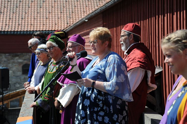 Kulturminister Trine Skei Grande var en av mange som besøkte Hamar middelalderfestival på Domkirkeodden 8.-10. juni 2018. Statsråden hyllet både museet på Domkirkeodden og ikke minst frivilligheten, under sin tale.