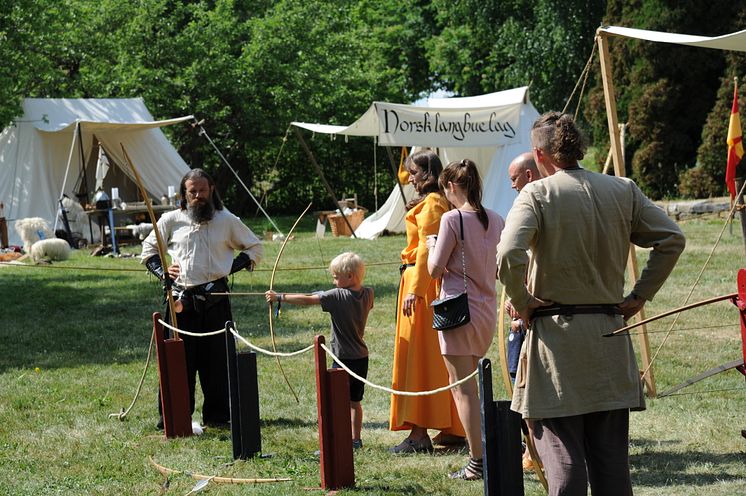 Bueskyting er en populær aktivitet på Middelalderfestivalen, særlig blant de minste. Kulturminister Trine Skei Grande var en av mange som besøkte Hamar middelalderfestival på Domkirkeodden 8.-10. juni 2018.
