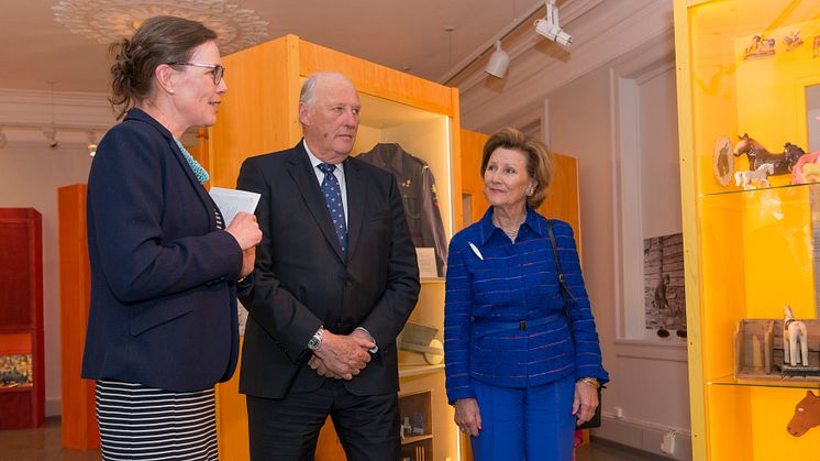 Deres Majesteter Kongen og Dronningen gjennomførte i perioden 11. til 14. juni 2017 en jubileumsreise med besøk til fylkene Hedmark og Oppland. Kongen og Dronningen avsluttet sin 80-års jubileumsreise i Innlandet med å besøke Kvinnemuseet og Kongsvinger. Bildet er tatt under omvisning på Kvinnemuseet, hvor konservator Mona Holm orientere Kongen og Dronningen om den nye utstillingen på museet.