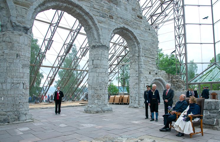 Deres Majesteter Kongen og Dronningen gjennomførte i perioden 11. til 14. juni 2017 en jubileumsreise med besøk til fylkene Hedmark og Oppland. Her fra Kongen og Dronningens besøk ved Anno Domkirkeodden under Hamar middelalderfestival.