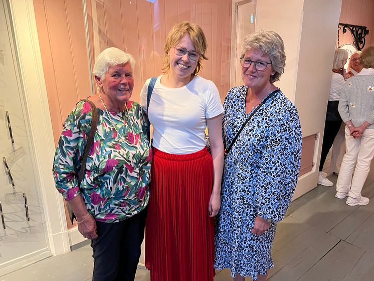 Fra Anno Kvinnemuseets 30-årsfeiring 31. mai 2025. Tre generasjoner på utstillingsåpning: Andrea Lillemo, flankert av mormor Grete Amundsen og mor Kristin Lillemo.