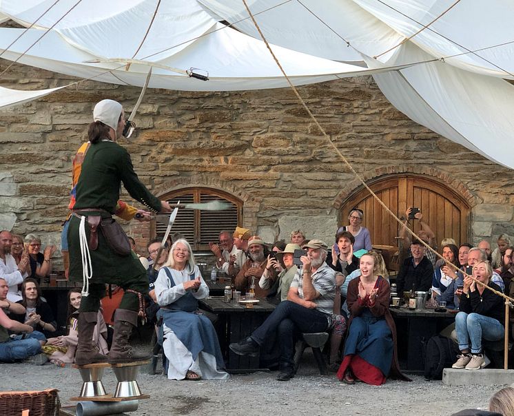 Hamar middelalderfestival på Anno Domkirkeodden tiltrekker seg en rekke dyktige aktører og bidragsytere - som denne sjongløren, som imponerte publikum stort da han sjonglerte med sverd mens han balanserte. (Foto: Magnus S. Holte/Anno)