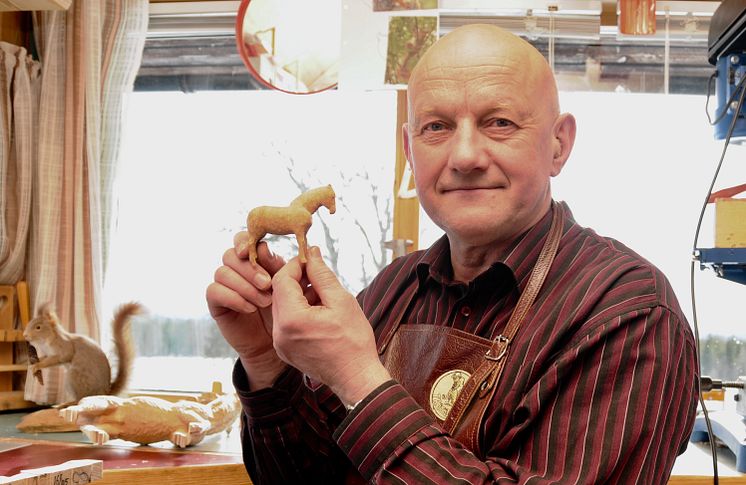 Treskjærer Ragnar Nysæther, her med sin aller første trefigur som han lagde 9 år gammel, mottar Sandbeck-prisen 2019.
