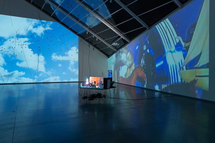 Cauleen Smith, …we are running…, 2024. Multi-channel video installation with live feed video and sound. Dimensions variable. 6:38 min. Installation view, The Deep West Assembly, Cauleen Smith. Astrup Fearnley Museet, 2024. Photo: Christian Øen.
