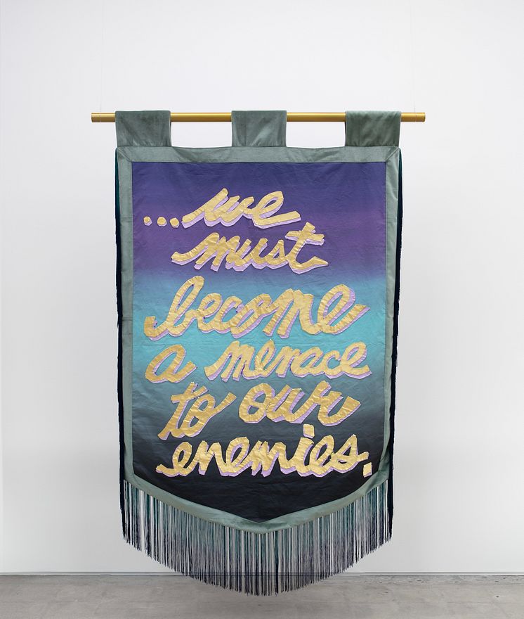 Cauleen Smith, ... we must become a menace to our enemies, 2022. Cloth, acrylic, satin, paper, sequins, fringe, velvet, velour, and gold anodized aluminium rod. 203 x 137 cm. Courtesy of the artist and Morán Morán.