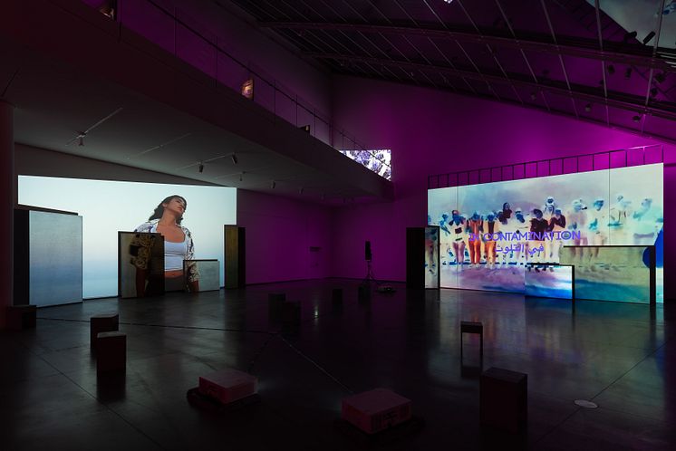 Exhibition view, Basel Abbas og Ruanne Abou-Rahme, An echo buried deep deep down but calling still, 2023.