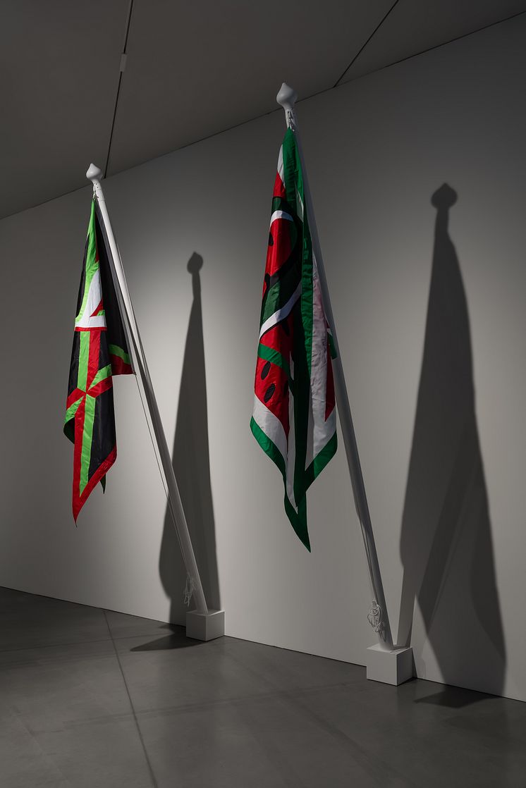 Til venstre: Swallowtail Seven Never Surrenders, 2023. Til høgre: The Limits of Hospitality, 2023. Utstillingsfoto fra The Deep West Assembly, Cauleen Smith. Astrup Fearnley Museet, 2024. Foto: Christian Øen.