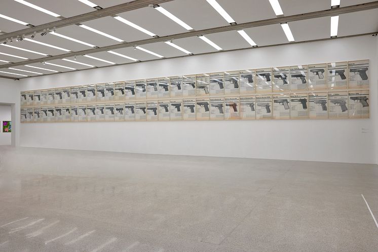 Lutz Bacher, FIREARMS, 2019.Installasjonen består av 58 deler. Foto © mumok - Museum moderner Kunst Stiftung Ludwig Wien, Leihgabe der Österreichischen Ludwig-Stiftung. Med tillatelse fra Estate of Lutz Bacher og Galerie Buchholz.
