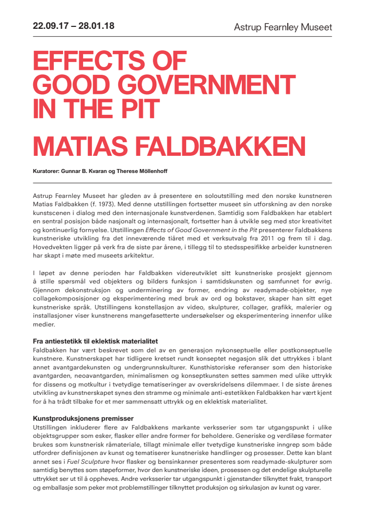 Astrup Fearnley Museet har gleden av å presentere en soloutstilling med den norske kunstneren Matias Faldbakken (f. 1973). Med denne utstillingen fortsetter museet sin utforskning av den norske kunstscenen i dialog med den internasjonale kunstverdenen. Samtidig som Faldbakken har etablert en sentral posisjon både nasjonalt og internasjonalt, fortsetter han å utvikle seg med stor kreativitet og kontinuerlig fornyelse. Utstillingen Effects of Good Government in the Pit viser Faldbakkens kunstneriske utvikling fra det inneværende tiåret med et verksutvalg fra 2011 og frem til i dag. Hovedvekten ligger på verk fra de siste par årene, i tillegg til to stedsspesifikke arbeider kunstneren har skapt i møte med museets arkitektur. I løpet av denne perioden har Faldbakken videreutviklet sitt kunstneriske prosjekt gjennom å stille spørsmål ved objekters og bilders funksjon i samtidskunsten og samfunnet for øvrig. Gjennom dekonstruksjon og underminering av former, endring av readymade-objekter, nye collagekomposisjoner og eksperimentering med bruk av ord og bokstaver, skaper han sitt eget kunstneriske språk. Konstellasjonen av video, skulpturer, collager, grafikk, malerier og installasjoner viser kunstnerens mangefasetterte undersøkelser og eksperimentering innenfor ulike medier.