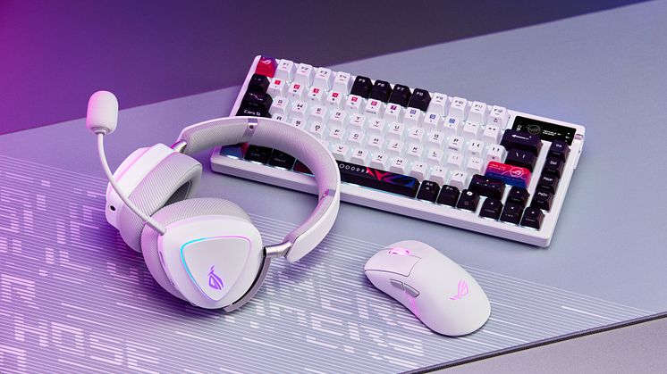 Latest ROG gaming peripherals include the Azoth X keyboard, Keris II Origin mouse, Scabbard II Arctic Gray XXL mousepad, and Delta II Moonlight White headset