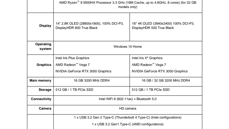 - Power to create: Up to Intel Core i7-11370H or AMD Ryzen 5900HX CPU, NVIDIA GeForce RTX 3050 graphics, 32 GB DDR4 memory, 1TB SSD, and 96 Wh high-capacity battery
