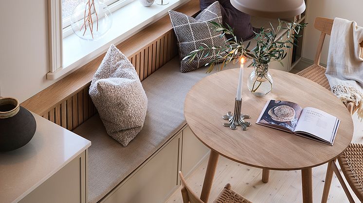 Kjøkken trenger ikke være polert og stramt for å være fint. Tekstur og variasjon gir dybde og en mer hjemmekoselig følelse. Tenk på taktile materialer som rillede glass eller overflater som føles autentiske og levende. Kombinasjoner som grovt lin, matt keramikk, treverk og glatte fliser gir dybde og et mer personlig uttrykk. Legg gjerne til gardiner, filleryer eller myke puter ved spiseplassen – det gjør underverker for helheten