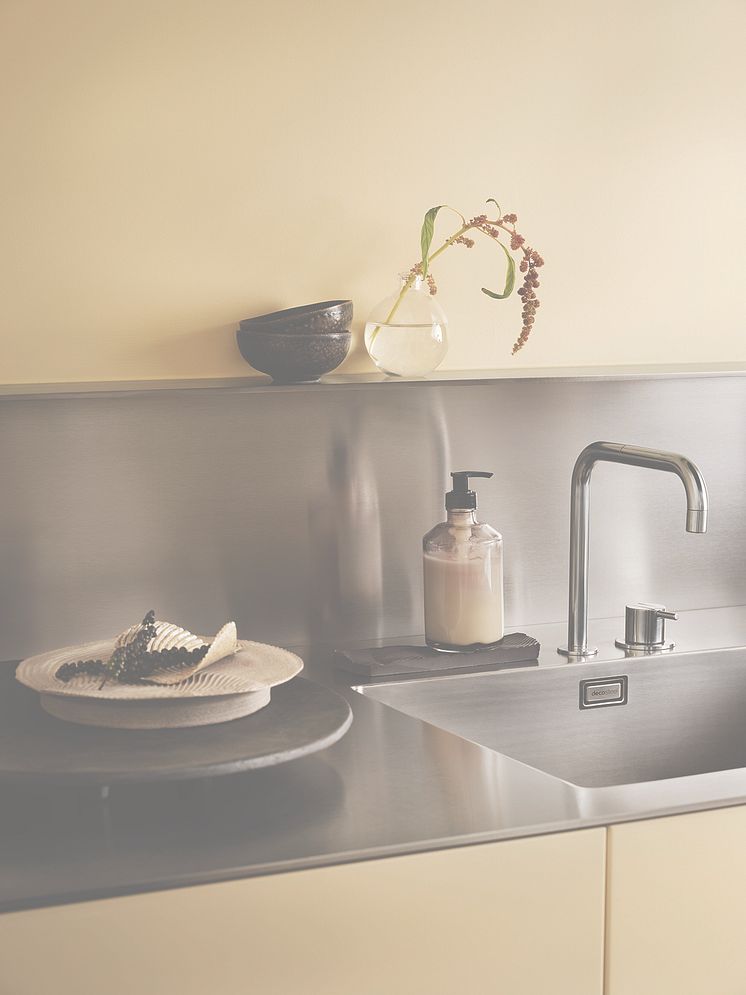 Om man ønsker en enkel stil som denne, passer det fint med solide 6 mm benkeplater i stål, sprutbeskyttelse og hylle.